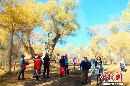 轮台胡杨公园里游人如织,观赏美景游人达到高峰。 杨厚伟 摄