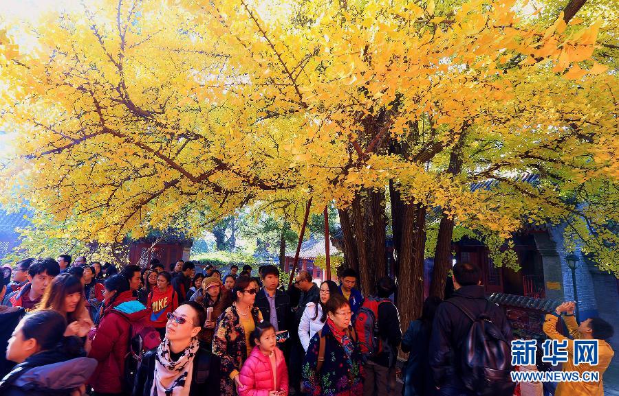 11月1日,游客在北京怀柔红螺寺景区观赏千岁银杏树。深秋周末,万余名游客走进京郊怀柔红螺寺旅游景区,观赏具有千年历史的古老银杏树,金黄色的叶子挂满枝头,美不胜收。 新华社发(卜向东 摄)