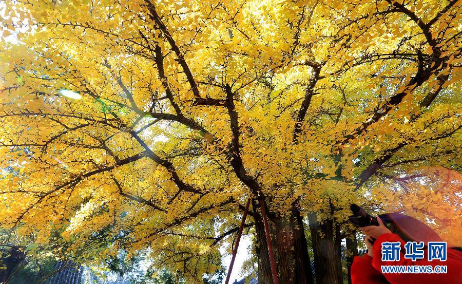 11月1日,一名游客在北京怀柔红螺寺景区拍摄千岁银杏树。深秋周末,万余名游客走进京郊怀柔红螺寺旅游景区,观赏具有千年历史的古老银杏树,金黄色的叶子挂满枝头,美不胜收。 新华社发(卜向东 摄)