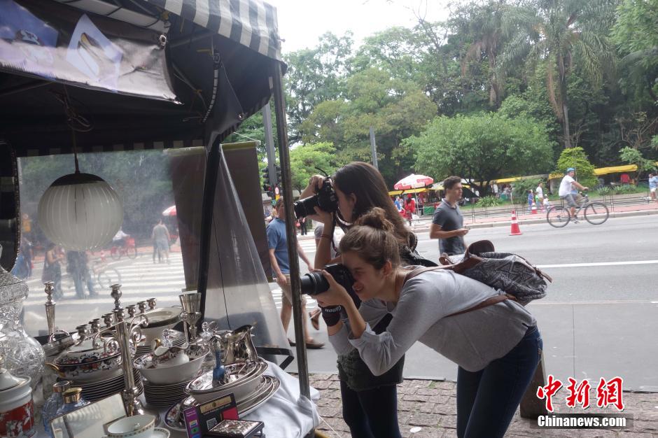 巴西圣保罗保利斯塔大街有一个周日古玩集市,只星期日开张,这里摆卖的古玩有瓷器、银器、灯饰、旧款相机、老款留声机、旧钟表等,品类繁多,吸引了众多顾客,生意红火。图为:11月1日两名路过的女游客对着一些银器用具照相。