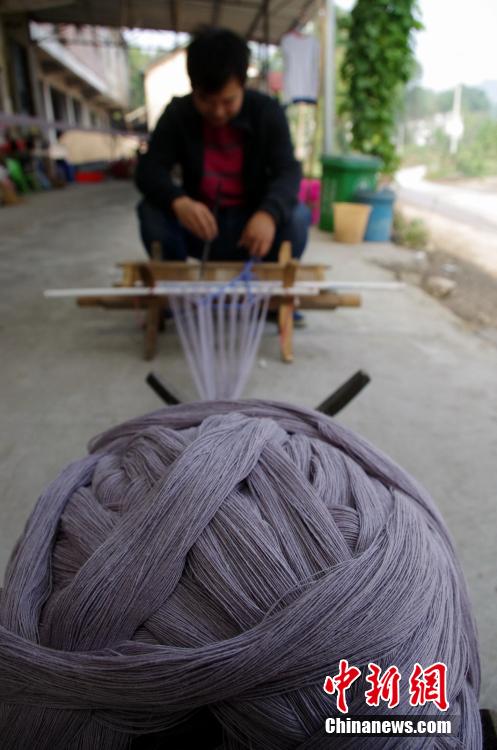 万载县马步乡黄村,宋树牙的儿子宋涛子承父业,在家门口织造夏布。他将染好色的麻纱一根根穿过用竹篾编成的长条形筛子,这道工序称为“过扣”。王昊阳 摄