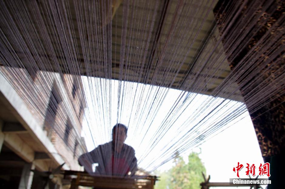 经过“过扣”后的麻纱被拉直,再刷上一层用米粉熬制成的胶水。这一道工序称为“刷布上浆”。王昊阳 摄