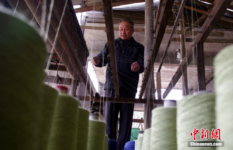 万载县马步乡现存传统手工制作夏布的农户约有40家,宋树牙经常要去他们家中察看织造情况,作些指导。农户织造完成的夏布,都交与宋树牙售卖。图为宋树牙在村民郭冬生家察看夏布生产情况。王昊阳 摄