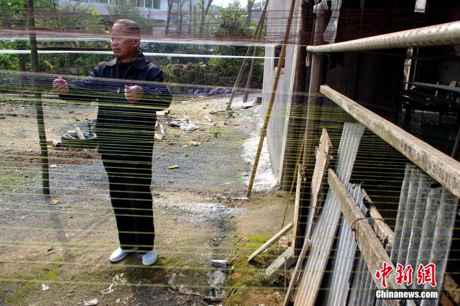 因传统的上浆工艺既慢且费力,宋树牙发明了更快更简便的上浆工艺,他将胶水放入一个特制的浅槽内,将一根根麻纱从槽内拉出,麻纱均匀粘满胶水后,可直接进行晾晒。这一发明使上浆工序大大加快。王昊阳 摄