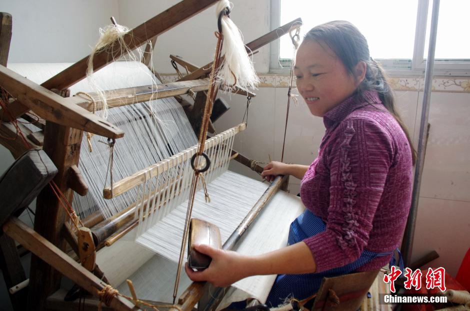 麻纱晾晒干透后,放入木制的织布机内开始织造。42岁的龙思珍每天都会在家里的织布机上织几个小时,每个月能赚到千余元,因为织布时需要手脚并用,不能停顿,忙完后就会一身酸痛。宋树牙说,30年前村里每家每户都天天传出织布声,现在那些织女们都慢慢变老了,越来越少了。担心再过二十年,传统夏布织造工艺会失传。王昊阳 摄