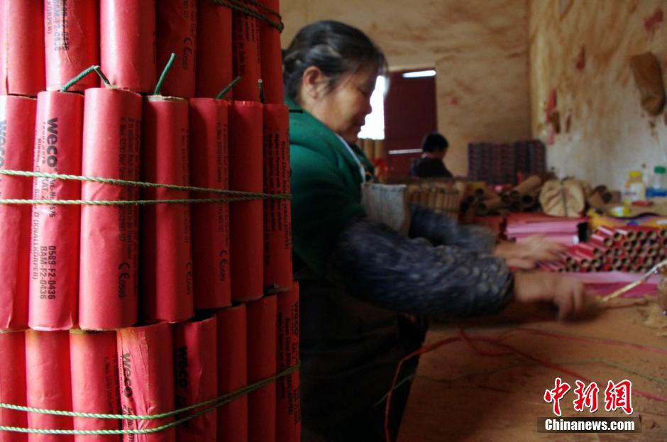 花炮制作的第八道工序:滚皮。花炮晾晒干透后,工人将印有文字或图案的包装纸贴在纸筒表面。图中这批花炮贴纸上印有英文字样,属于出口产品。王昊阳 摄
