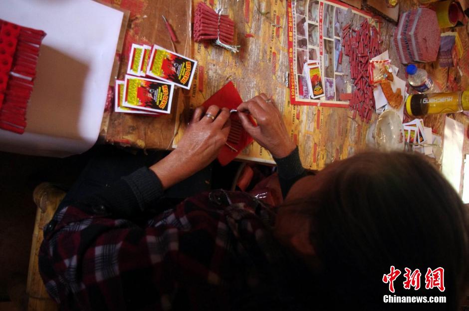 花炮制作的第九道工序:结鞭。小型花炮需要将引线互相缠绕、捆扎起来,可实现持续燃放。这一工序称为结鞭。王昊阳 摄