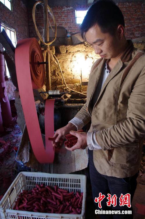 花炮制作的第二道工序:扯筒。工人将裁剪小的红纸放入机器,由机器自动翻卷,成为纸筒。王昊阳 摄