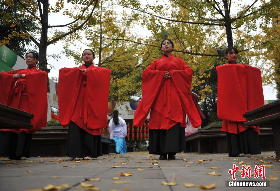 11月22日,汉服爱好者们正在练习成人礼动作。当日,四川乐山一群身穿汉服的年轻男女,走上街头举行了一场集体汉服成人礼,吸引了无数路人驻足围观,汉服爱好者们希望通过这种方式让更多的民众了解中国古代礼仪以及汉文化。