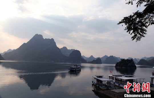 10月9日,游客在享有“中国下龙湾”美称的广西南宁市上林县大龙湖景区参观。中新社发 杨志雄 摄