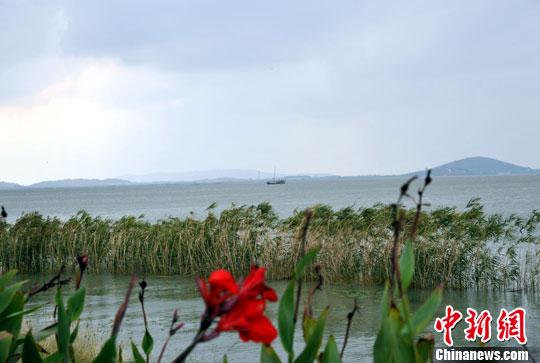 10月15日,在太湖苏州岸边,远处渔船共小岛一色,近处芦苇同红花相映。中新社发 孙自法 摄