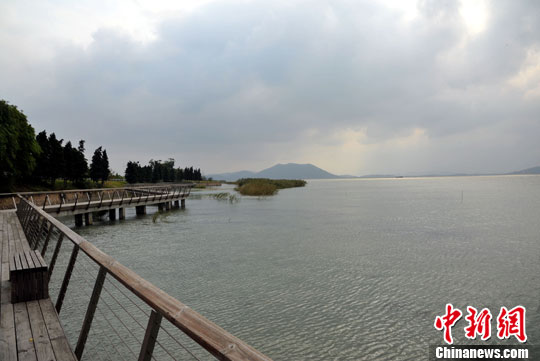 10月15日,太湖苏州岸边,木质栈桥沿岸逶迤而行,空中浓云密布,一派秋雨欲来的湖光水色。中新社发 孙自法 摄