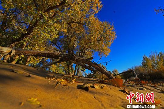 金秋时节,位于甘肃省张掖市高台县黑泉乡沙漠腹地的胡杨林,在夕阳的映照下泛出醉人的金黄色,为浩瀚的大漠增添了一道靓丽的风景。 成林 摄