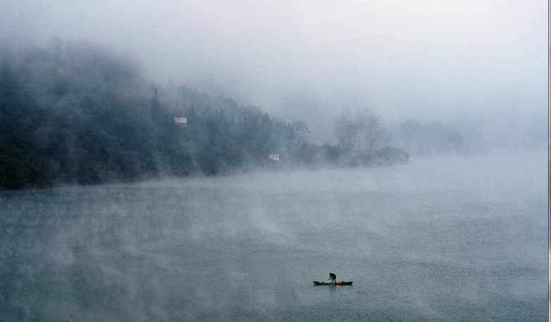 冬日清晨,湖北省恩施土家族苗族自治州宣恩县湖面雾气飘渺,勤劳的渔夫仿佛穿行于仙境中捕鱼。 新华社发(宋文 摄)