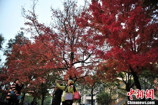 图为民众在枫叶树下拍照。吕明 摄