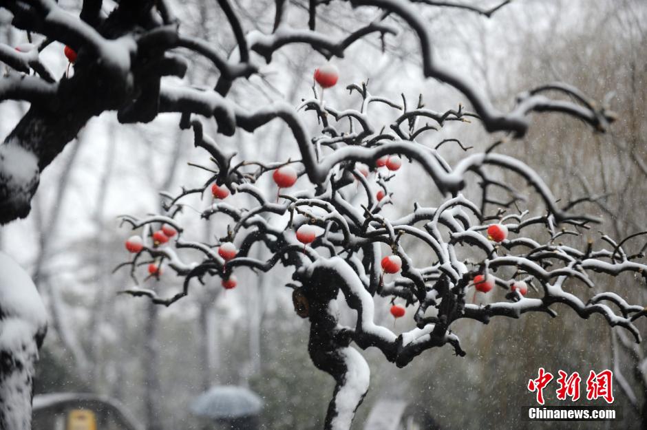 2月18日,江苏扬州大雪纷飞,颇具江南韵味的扬州古典园林瘦西湖景区银装素裹、如诗如画,呈现出一派“北国风光”,吸引了不少市民和游客走出户外,感受春雪带来的快乐。图为树上悬挂的红灯笼被白雪覆盖。孟德龙 摄