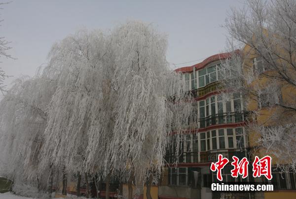 3月11日,一场春雪过后,地处新疆天池脚下的兵团第十二师二二二团处处呈现出迷人的雾凇美景。在大雾笼罩下白雪晶莹剔透,引得行人驻足拍照,似乎要想要将这阳春三月天里的最后一抹“冬景”定格在这个瞬间。雾凇,非冰非雪,而是由于雾中无数零摄氏度以下而尚未结冰的雾滴随风在树枝等物体上不断积聚冻粘的结果,表现为白色不透明的粒状结构沉积物,俗称树挂,是可遇不可求的自然奇观。图为第十二师二二二团的雾凇美景。周银 摄