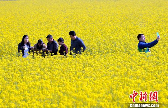 3月15日,江西省德兴市泗洲镇游客来到婺源县太白镇油菜花海踏春赏花。