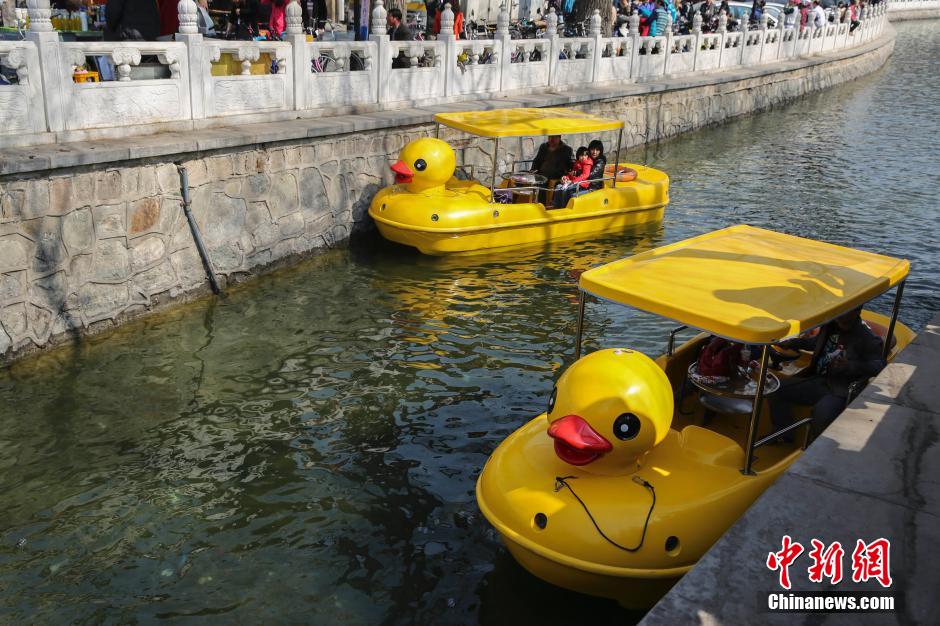 3月15日,游人们乘坐“黄鸭”造型的游船在什刹海游玩。当日,30只“黄鸭”造型电瓶船正式下水迎客。