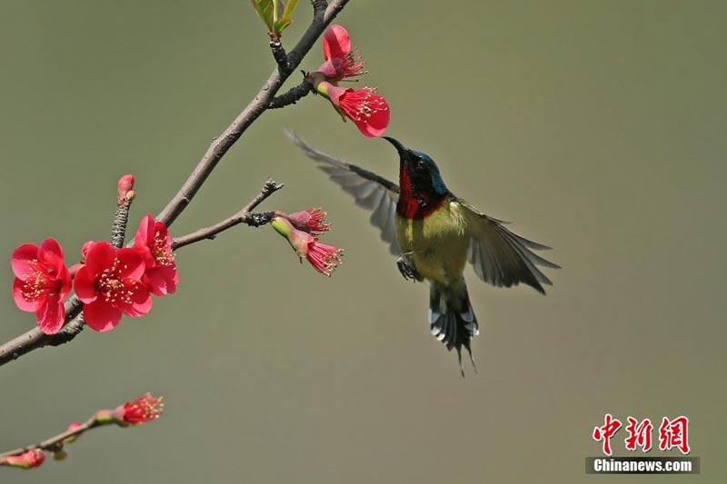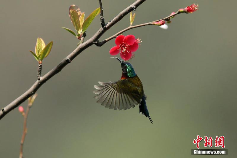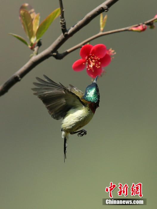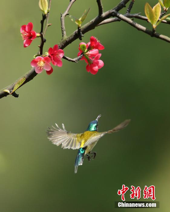 3月16日下午,一只美丽的太阳鸟在四川宜宾市白塔山风景区的海棠花丛中觅食。太阳鸟属雀形目,是95种颜色漂亮的小鸟,全身闪烁着紫、红、金黄等色彩。从500多年以前起,西欧妇女就以它们的饰羽作为帽饰。由于它的羽毛鲜艳无比,体态华丽绝美,人们又称其为“天堂鸟”、“极乐鸟”、“女神鸟”等,是世界上著名的观赏鸟。中新社发 曾朗 摄