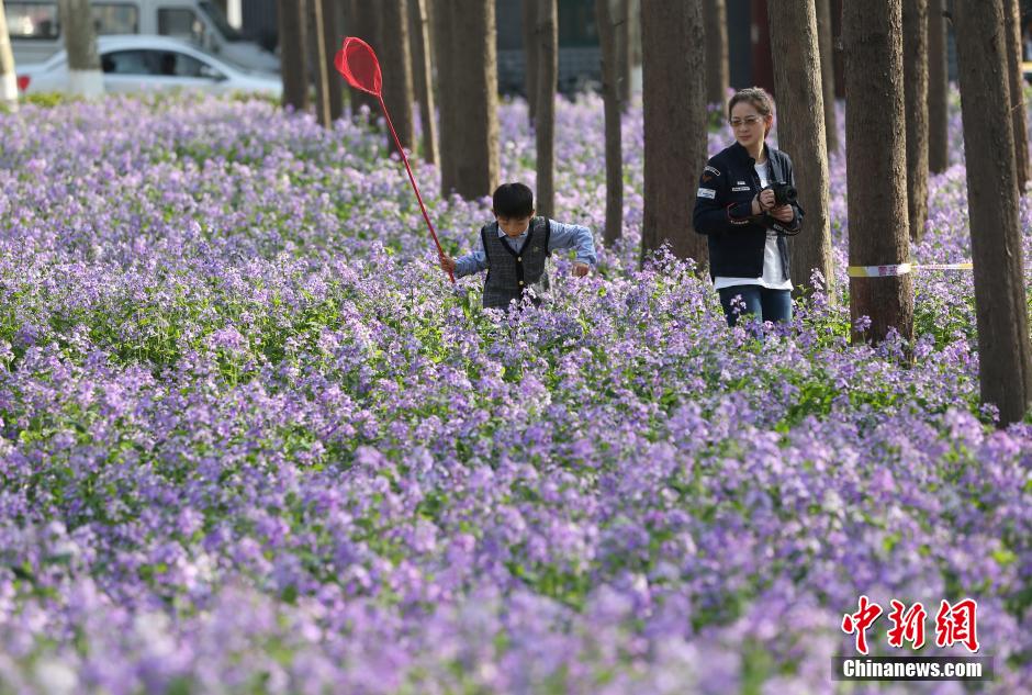 3月17日,市民在“二月兰”旁休闲。眼下正是中国江南地区春暖花开之时,梅花、海棠花、樱花争相开放,在南京理工大学校园内,被称为城市一景“二月兰”盛开如海洋一般,吸引了大批市民和游客前往踏青赏花,尽享浓浓春意。中新社发 泱波 摄