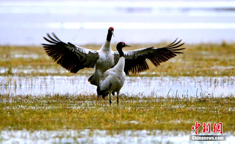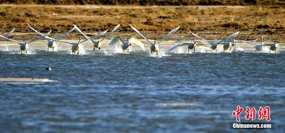 白天鹅每年在郭茂滩湖水中过冬,每年三月左右离开。图为尕海湖中过冬的天鹅准备起飞觅食。张勇 摄