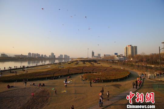 3月22日,山西太原风和日丽春光灿烂,又恰逢周末。傍晚时分,许多当地市民与家人、朋友在汾河公园放风筝,感受春日的温暖。中新社发 张云 摄