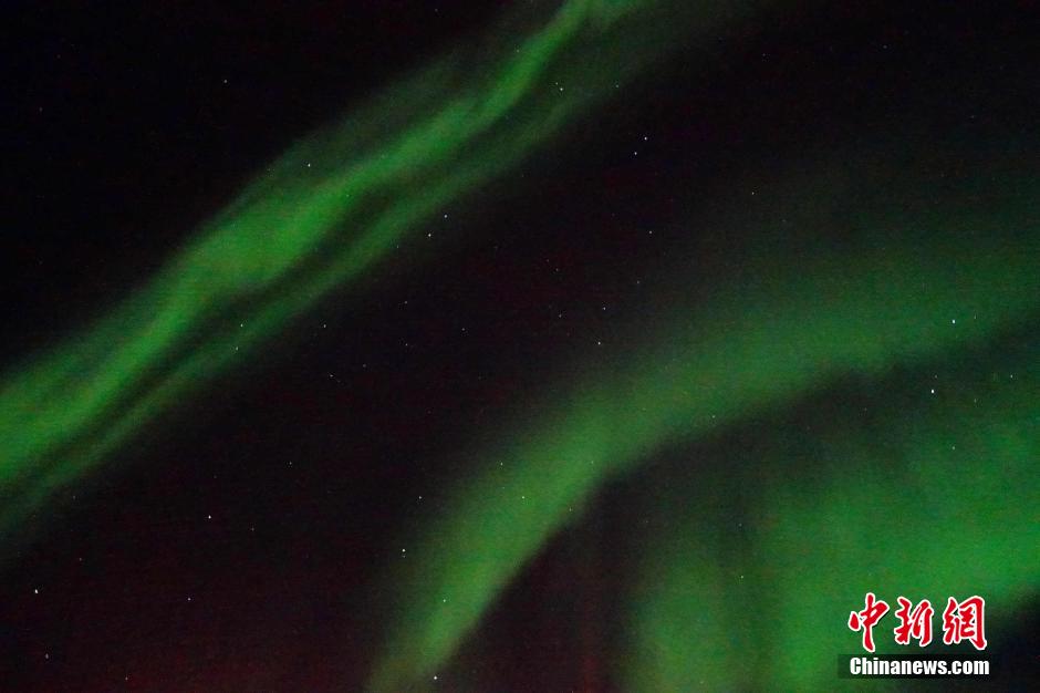 位于北极圈内的加拿大北部社区是观察北极光的重要地点。图为近日在濒临北冰洋的小镇图克托亚图克拍摄到的北极光。中新社发 徐长安 摄