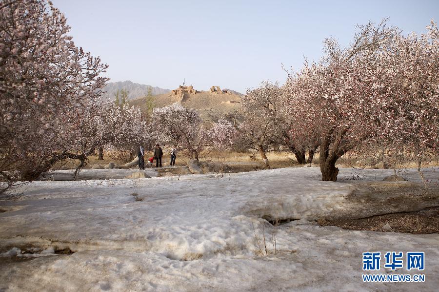 4月5日,在新疆哈密庙尔沟景区内,游客在观赏盛开在冰雪上的杏花。
