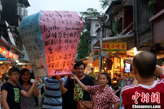 4月12日,旅客在台湾新北市的平溪十分寮点燃盏盏天灯,一边旅游一边祈福。中新社发 李志全 摄