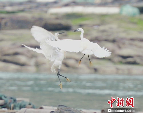 4月26日,福建石化重地泉港两只白鹭争斗。中新社发 王东明 摄