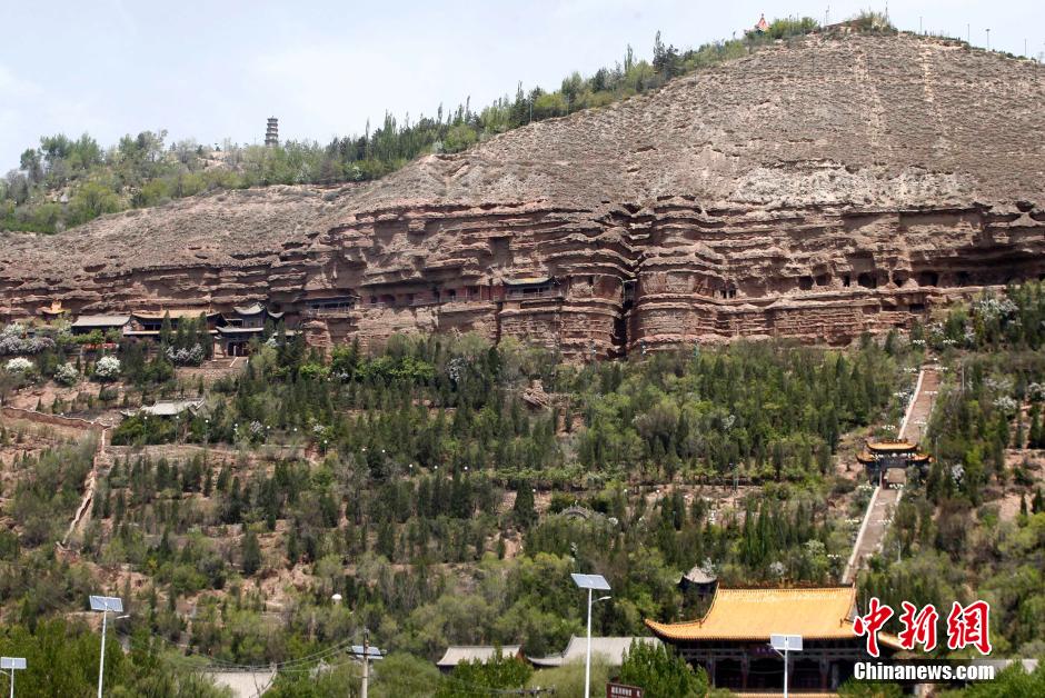 北禅寺是青海境内最早的宗教建筑,位于西宁北山,初建于北魏明帝时期,距今已有一千八百多年。整个建筑背倚北山,基本上是依山腰中的红砂岩天然断层由西向东依次而建,上载危岩,下临深谷,楼阁悬立,结构奇巧。栈道回廊将殿宇楼阁与洞穴相连,使殿中有洞,洞内套洞,洞中塑有佛道诸神像,素有“九窟十八洞”之称,为中国第二大悬空寺。北禅寺早先为佛教寺庙,后成为道教寺庙。北禅寺内现保留有部分从隋唐至明清的壁画,艺术价值很高,曾有“西平莫高窟”之称。但由于年代久远,风雨不断洗礼,山体已很不稳定,绝壁已出现多条裂缝,九窟十八洞现只能看到一小段,其余大部分已岌岌可危,无法开放。图为远眺北禅寺,在蓝天白云的衬托下显得分外壮观。中新社发 胡友军 摄