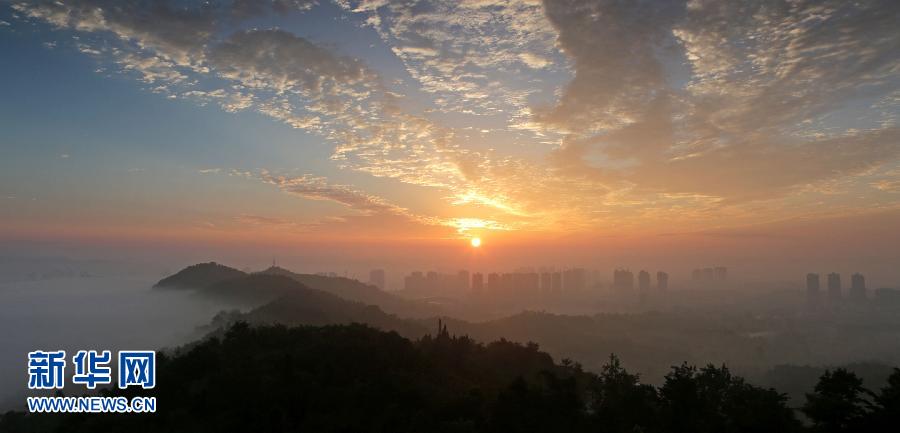 7月16日清晨,流云景观和艳丽朝霞同时出现在重庆市大足区,景观若云中仙境,格外迷人。 新华社发(罗国家 摄)