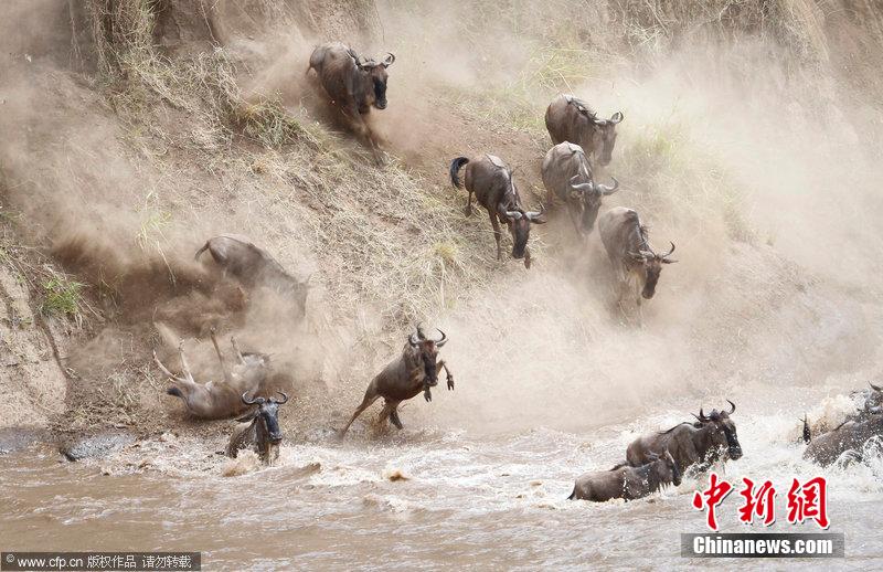 近日,肯尼亚马赛马拉保护区,数千角马迁徙途中跳入马拉河,一路狂奔尽力躲避河内饥饿鳄鱼袭击。有的角马跳跃高度达到了20英尺。这一戏剧性一幕被一位摄影师用镜头记录下来。图片来源:CFP视觉中国