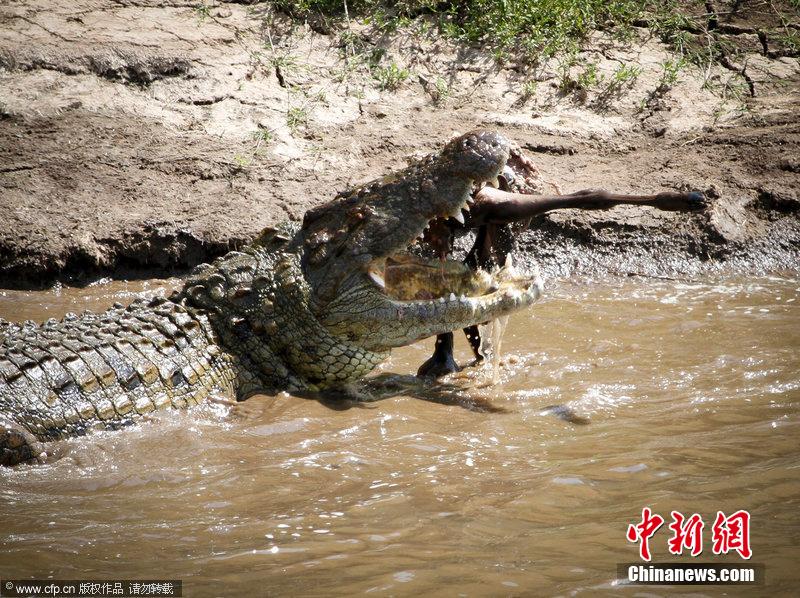 近日,肯尼亚马赛马拉保护区,数千角马迁徙途中跳入马拉河,一路狂奔尽力躲避河内饥饿鳄鱼袭击。有的角马跳跃高度达到了20英尺。这一戏剧性一幕被一位摄影师用镜头记录下来。图片来源:CFP视觉中国