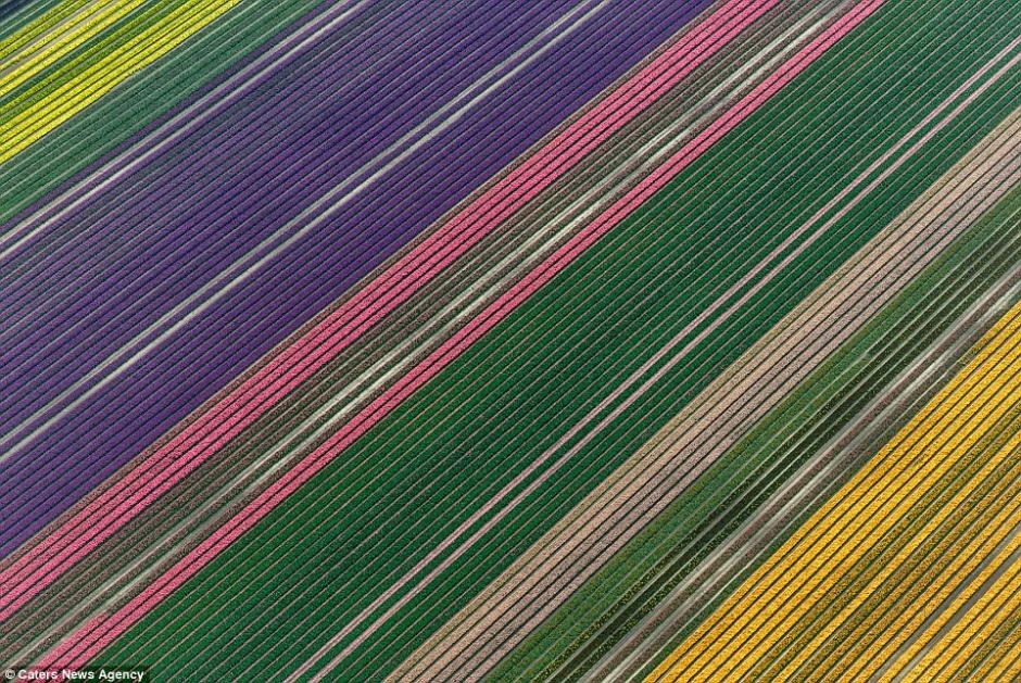 据英国《每日邮报》2014年8月22日报道,来自意大利罗马的摄影师Simone Sbaraglia来到荷兰阿姆斯特丹,俯拍了这五彩的郁金香田野,画面精致得就像是抽象画一样。