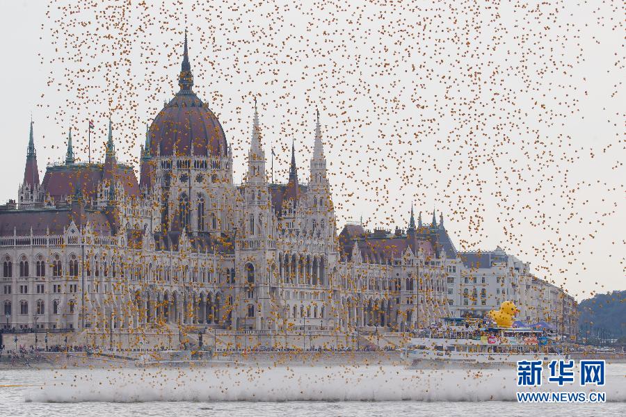 8月31日,在匈牙利首都布达佩斯,数万只橡皮鸭从玛吉特桥上倾泻而下。当日,一场带有慈善性质的橡皮鸭漂流比赛在多瑙河上举行,约有5.2万只橡皮鸭漂浮在多瑙河上,场面蔚为壮观。 新华社发(弗尔季·奥蒂洛摄)
