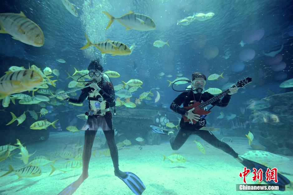 9月1日,几名摇滚乐手在“海底摇滚音乐会”上演奏。当天,为迎接即将来临的中国传统节日中秋佳节,天津海昌极地海洋世界组建的“海洋乐队”的乐手们在海底隧道,配以现场外一只真实乐队的演奏,为游客呈现独特的“海底音乐会”。中新社发 佟郁 摄