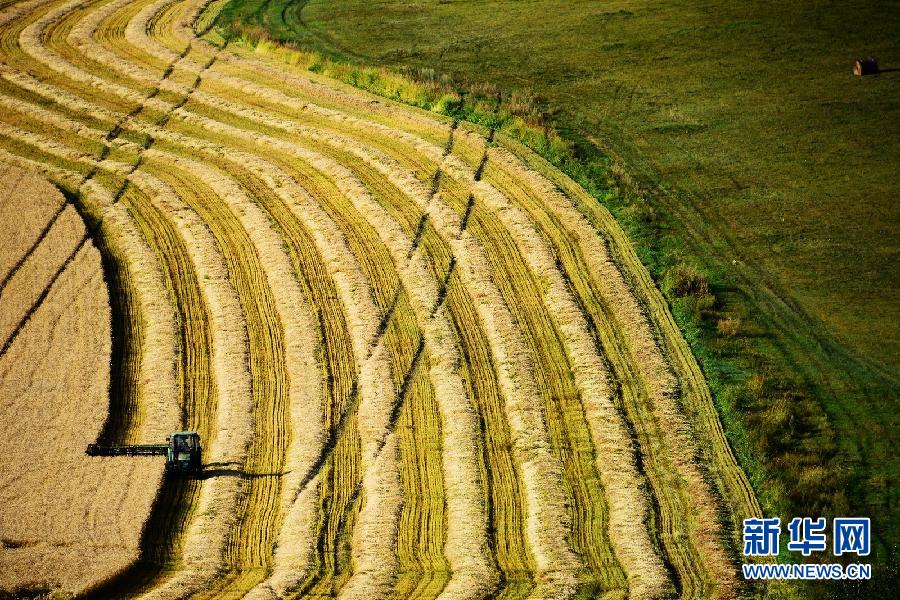 9月2日,在内蒙古额尔古纳市广袤田野里,割晒机正在割晒小麦。额尔古纳市今年粮油种植面积230万余亩,预计总产量达到9亿斤。目前,当地正集中机械力量抓紧时间抢收粮食,确保实现颗粒归仓。新华社发(王志强 摄)