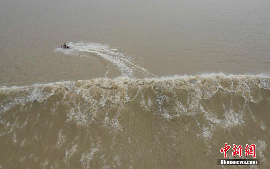 被誉为“天下第一潮”的钱江潮在农历八月十六(9月9日)开始,已进入最佳观赏期,到八月十八达到顶峰。9日,在浙江省杭州市萧山钱江观潮城,远远看去,潮水在天际形成一条白线,快速向前推进,只见白浪翻滚。在惊涛骇浪中,数名摩托艇手驾驶着摩托艇,逐浪钱塘江。中新社发 詹星玮 摄
