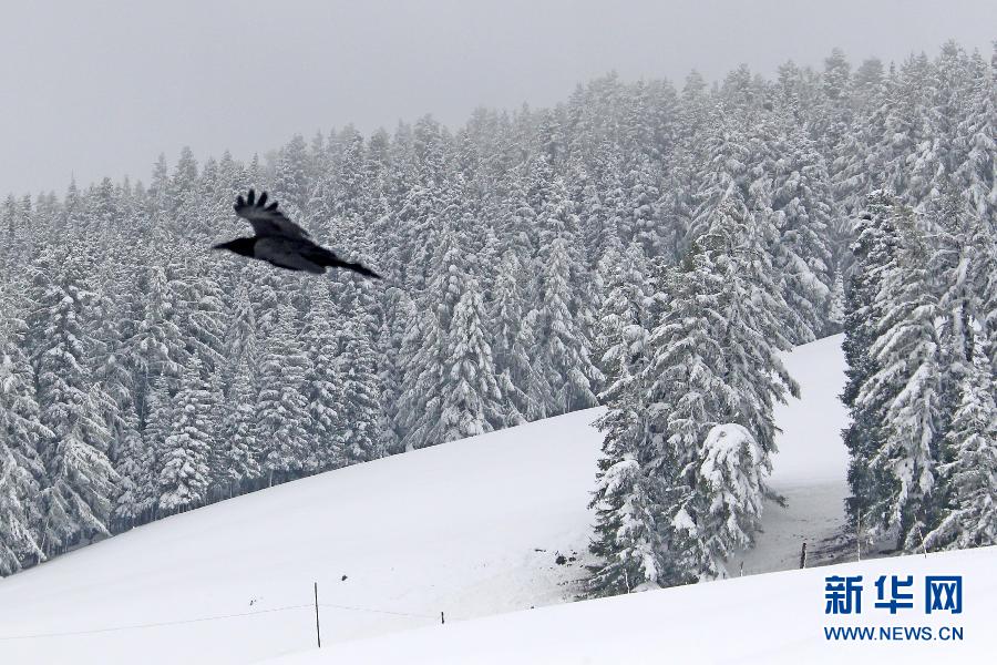 9月12日,一只鸟在新疆哈密北部的树林上空飞翔。受冷空气影响,新疆哈密北部出现了降温、降雪天气,沿天山一带银装素裹,成为秋日里独特的风景线。 新华社发(蔡增乐 摄)