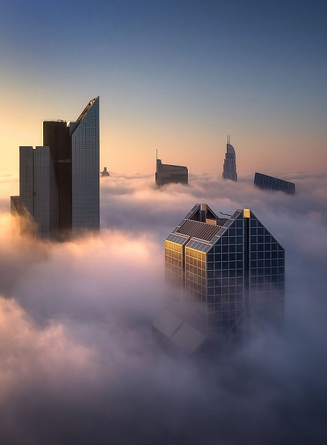 美摄影师拍摄迪拜摩天大楼云雾中“漂浮”