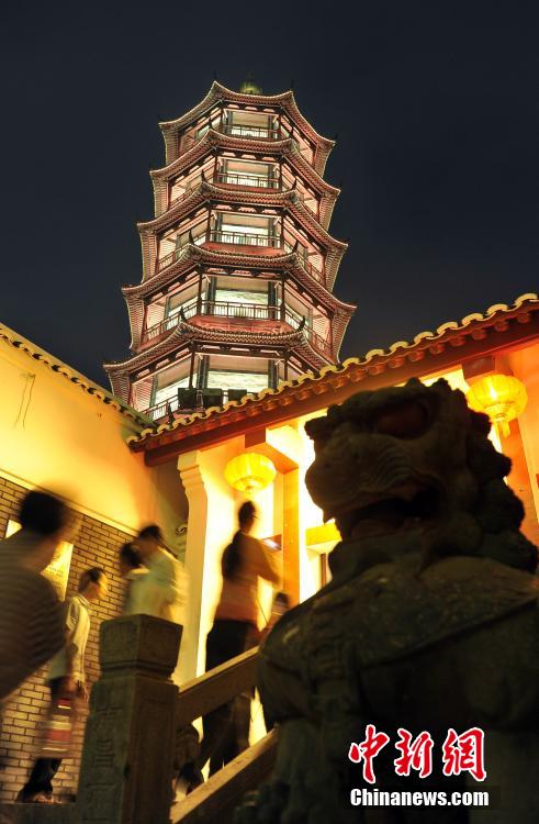 9月22日,为期18天的江西南昌绳金塔美食文化艺术节暨第十三届绳金塔庙会正式拉开帷幕。当晚,绳金塔下景色靓丽、美食汇集、节目精彩,吸引了大量市民和游客慕名而来,他们在这里可以尽情吃喝玩乐,享受惬意生活。绳金塔庙会作为南昌市一个特殊的节日,每年九月至十月在千年古塔绳金塔内举行。图为走过豫章驿道牌坊,就是特色小吃夜市街。绳金塔街以南昌特色小吃为主,引进全国各地小吃。 刘占昆 摄