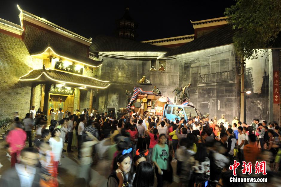 9月22日,为期18天的江西南昌绳金塔美食文化艺术节暨第十三届绳金塔庙会正式拉开帷幕。当晚,绳金塔下景色靓丽、美食汇集、节目精彩,吸引了大量市民和游客慕名而来,他们在这里可以尽情吃喝玩乐,享受惬意生活。绳金塔庙会作为南昌市一个特殊的节日,每年九月至十月在千年古塔绳金塔内举行。图为在道路中段,还有“乔迁大吉”铸铜的雕塑,吸引了大量游客和市民参观。 刘占昆 摄