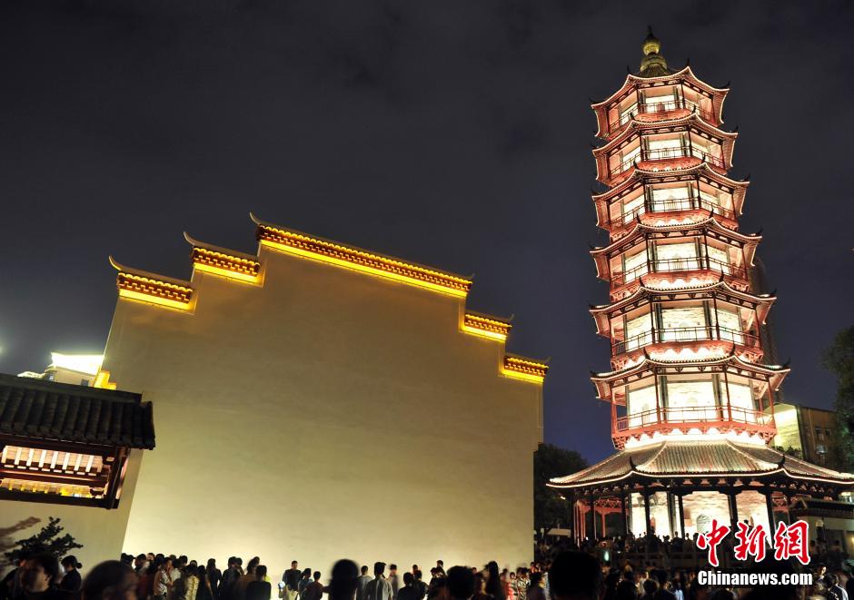 9月22日,为期18天的江西南昌绳金塔美食文化艺术节暨第十三届绳金塔庙会正式拉开帷幕。当晚,绳金塔下景色靓丽、美食汇集、节目精彩,吸引了大量市民和游客慕名而来,他们在这里可以尽情吃喝玩乐,享受惬意生活。绳金塔庙会作为南昌市一个特殊的节日,每年九月至十月在千年古塔绳金塔内举行。图为绳金塔下景色靓丽、美食汇集、节目精彩,吸引了大量市民和游客拍照。 刘占昆 摄