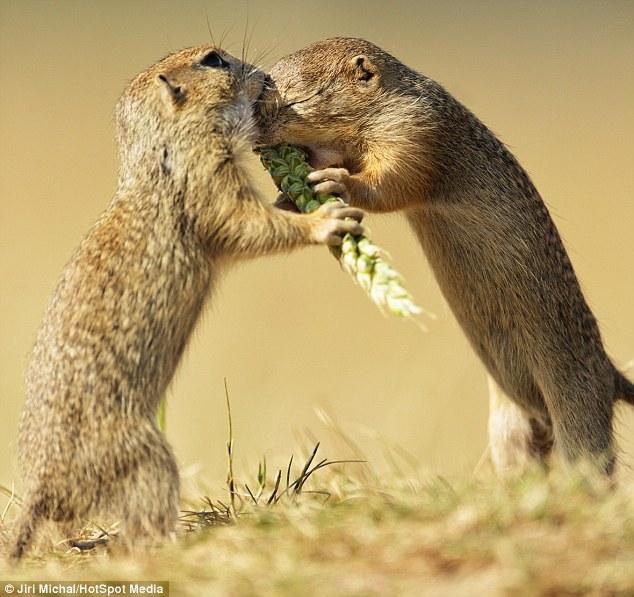 据《每日邮报》2014年10月9日报道,一组抓拍的两只松鼠抢夺食物的照片在网络走红,引众人围观。(网页截图)