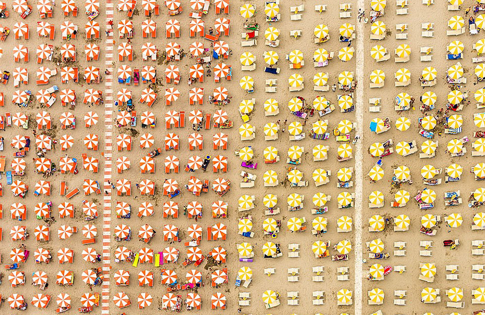 国际在线专稿:据英国《每日邮报》9月11日报道,德国摄影师贝恩哈德·朗格(Bernhard Lang)在意大利亚得里亚(Adriatic)海岸航拍到许多惊人的照片:数千名游客的遮阳伞在金色的海滩上摆出各种几何图案,创造出令人眼花缭乱的彩色效果图。朗格表示:“这些照片一方面可展示人类对自然环境的影响,另一方面则寓意人类只是渺小的生物,并非像我们想象的那样重要。”(沈姝华)