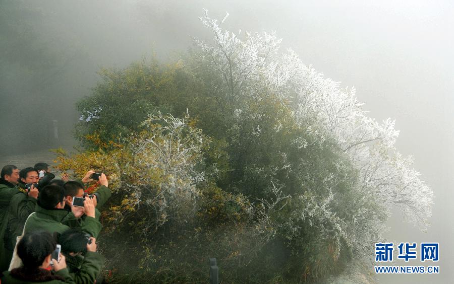 10月12日,游人在华山西峰拍摄骤然降温形成的冰凌。当日,西岳华山迎来降雪。山上红叶与陡然降温飘起的小雪构成一道奇特风景,给游客带来意外的惊喜。 新华社记者陶明摄