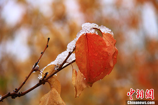 10月10日,受新疆冷空气的影响,地处甘肃河西走廊中部的张掖气温下降6到12度,城区内雨雪交加,祁连山区降下入秋以来的第一场大雪。经过一天一夜雨雪的洗礼,林中树叶有的红如枫叶,有的黄如金叶,五彩斑斓。挂在树叶上的积雪,随着天气转晴,开始融化,雪水在红色、黄色的树叶上形成一串串美丽的水珠。