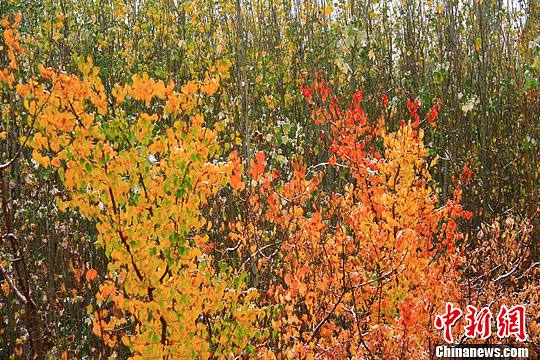 经过一天一夜雨雪的洗礼,林中树叶有的红如枫叶,有的黄如金叶,五彩斑斓。陈礼 摄